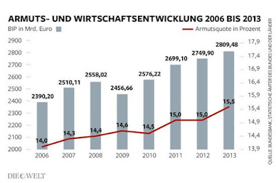 « Le taux de pauvreté, à 15,2%, a atteint un nouveau et triste record en 2012 », souligne l'édition 2013 du rapport annuel de cette organisation, qui s'appuie sur des données de l'institut allemand des statistiques (Destatis).